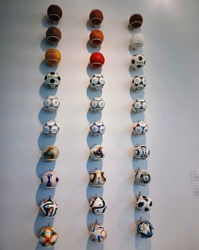 Photo caption: Especially visible in the display are World Cup soccer balls produced by Adidas, stretching from the early leather era to highly engineered contemporary designs. (Photo by Jonel Juste)
